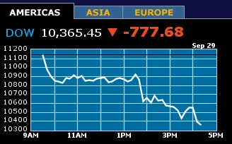 Americké trhy zkolabovaly. Stačilo k tomu jediné hlasování ve Sněmovně reprezentantů. Poslanci řekli těsné NE vládnímu plánu na záchranu amerických bank sužovaných břemenem dluhopisů napojených na rizikové hypotéky . Pár minut poté se index Dow Jones propadl o více než dvě stě bodů. Za celý den ztratil 778 bodů. O tolik bodů nepřišel během jednoho dne za celou svou historii. Index Standard & Poor’s 500 zaznamenal největší jednodenní ztrátu (8,8 %) od burzovního krachu v říjnu 1987. Za jediný den ztratily americké akcie celkovou hodnotu 1,2 bilionu dolarů, spočítala agentura Bloomberg. Tuto hodnotu měřenou hrubým domácím produktem vytvoří Česká republika za deset let.