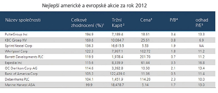 Na druhé straně výkonnostního žebříčku lze vypozorovat také zajímavé rysy. Seznam obsahuje dva developery nemovitostí PulteGroup a Barratt Developments, u kterých došlo ke zhodnocení o 195, respektive 120 procent. Vysoké zhodnocení je způsobeno lepšími výsledky v evropském a americkém stavitelství a zároveň bere v potaz zlepšené vyhlídky na rok 2013. Další zajímavou položkou na seznamu je Bank of America, která v roce 2011 byla jednou z nejhorších akcií. Díky razantním krokům, ke kterým mimo jiné patřilo i hromadné propouštění napříč různými divizemi banky, se jí podařilo svou trend obrátit.
