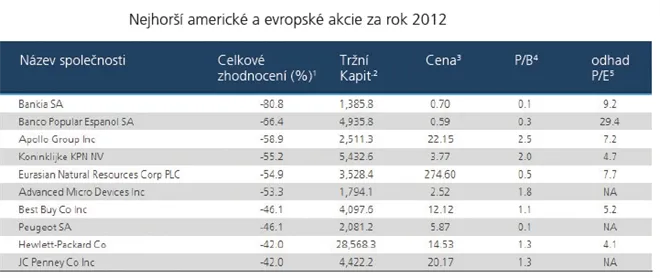 V tabulce vidíme deset nejhorších evropských a amerických akcií. Většina jmen nebudí žádné překvapení. Dvěma nejhoršími tituly jsou španělské banky. Peugot byl v loňském roce rád za finanční injekci od francouzské vlády, jeho výsledek nezaskočí a Hewlett-Packard byl nucen odepsat téměř devět miliard dolarů z akvizice softwarové firmy Autonomy a navíc bojuje se složitou organizační strukturou a slabými tržbami.