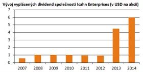 Akcie společnosti Icahn Enterprises bych rozhodně neoznačil za podhodnocené. Pohledem na čisté zisky z posledních pěti let jsou akcie drahé. Nicméně vzhledem k rychlé růstové tendenci tržeb a aktiv celého holdingu je takové ocenění ospravedlnitelné. Zároveň jsou akcie Icahn Enterprises velmi atraktivní při pohledu na vyplácené dividendy. Společnost v uplynulých dvou letech začala vyplácet vysoké dividendy a i pro rok 2015 zatím schválila čtvrtletní dividendu ve výši 1,50 dolaru, což dělá roční dividendový výnos zhruba 6,5 procenta před zdaněním čili přibližně 5,5 procenta po daních.
