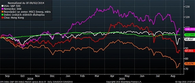 Investoři se od Číny rychle odvrátili; šanghajská burza za poslední měsíce spadla dohromady skoro o 40 procent. Vzápětí zamířily dolů i další akciové trhy. Země, kde akcie klesly jen o deset procent, můžou mluvit o štěstí. „Blbá nálada“ postihla i další aktiva. Padaly ceny komodit (ropa, energie, kovy,…), oslabovaly lokální měny, rostly rizikové přirážky. Ani bezpečné státní dluhopisy neposkytly investorům příliš útěchy. Kvůli současným extrémně nízkým výnosům jejich ceny nerostly, víceméně zůstaly na svém. Srpen zkrátka letos byl pro finanční investory naprosto katastrofální.