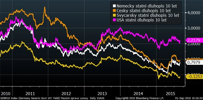 Výnosy státních dluhopisů se v srpnu příliš nepohnuly. Například výnosy české a německé desetileté dluhopisy mají výnosy výrazně pod úrovní jednoho procenta. Proběhla dokonce aukce prvních českých státních dluhopisů (se splatností tři roky), u kterých investoři nakupovali instrumenty se záporným výnosem! Ano, na tři roky si české penzijní fondy, pojišťovny a banky ukládají u státu za minus 0,001 procenta. Zprávy v podobném tónu se bohužel pomalu začínají přesouvat z žánru kuriozit do žánru šedá každodenní realita.