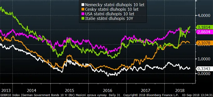 Investoři se tedy hledí zbavovat rizikových aktiv: pochopitelně akcií firem z nerozvinutých zemí, ale klesá i obecně důvěra v Evropu, takže i evropské akcie šly dolů. Na rozdíl od amerických. A kupovaly se dluhopisy, rostly jejich ceny, klesaly výnosy. Mezi výjimky patří italské státní dluhopisy, vláda, která tam nedávno nastoupila, se zatím hlásí spíš ke zvyšování výdajů než ke splácení dluhů.