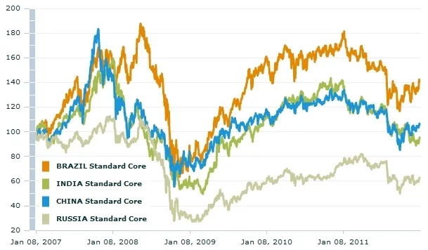 BRIC – Relativní vývoj indexů MSCI Brazil, Russia, India a China