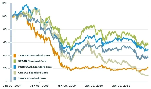 PIIGS – Relativní vývoj indexů MSCI Portugal, Ireland, Italy, Greece a Spain