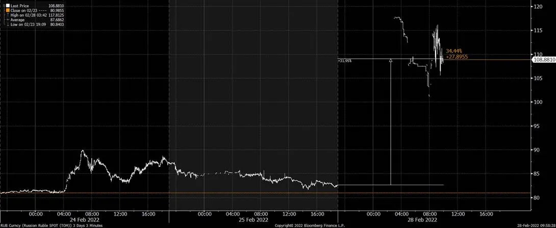 Ráno po otevření trhů rubl ztrácel asi třetinu. Následně mu pomohly intervence ruské centrální banky, i tak se následně pohyboval poblíž kurzu 100 rublů za dolar, což je oproti pátku o asi 20 % více.