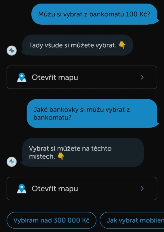„Můžu si vybrat z bankomatu 100 Kč? Jaké hodnoty bankovek můžu vložit do vkladomatu?“ Ať jsme otázku pokládali jakkoliv, výsledkem byl jen odkaz na seznam bankomatů. Mimochodem – bankomaty ČSOB jako jediné vydávají i stokoruny, zatímco v ostatních sítích je nejnižší hodnotou 200 Kč.