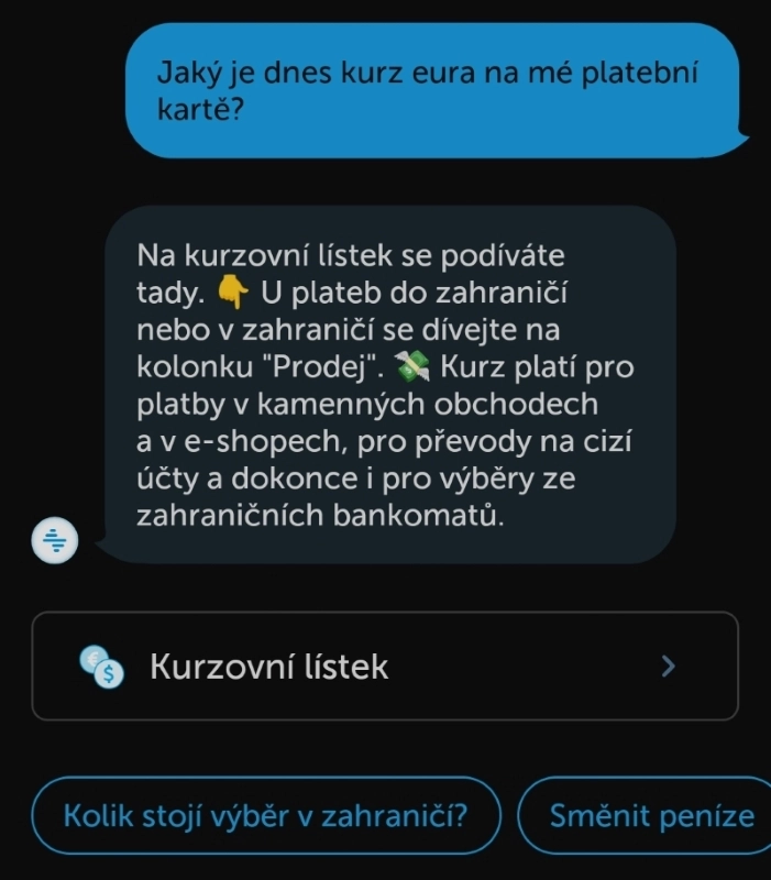 Hodně požadavků Kate vyřeší odkazem na příslušný dokument. Například otázce „jaký je dnešní kurz eura na platební kartě ČSOB“ rozumí, ale místo přímé odpovědi nabídne link (s nápovědou) na kompletní kurzovní lístek.