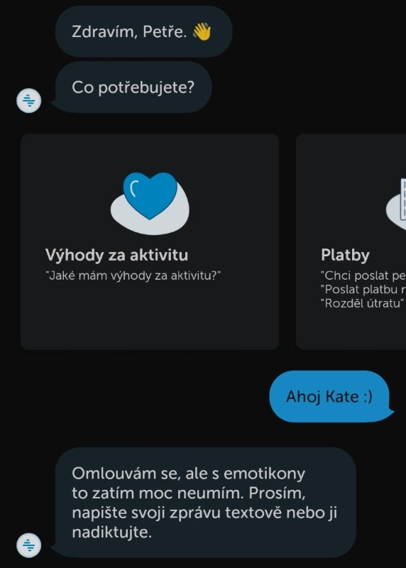 „Omlouvám se, ale s emotikony to zatím moc neumím. Prosím, napište svoji zprávu textově nebo ji nadiktujte,“ odpověděla bez čekání. Ve svých textech přitom sama používá třeba obrázky bankovek, potlesku a další.