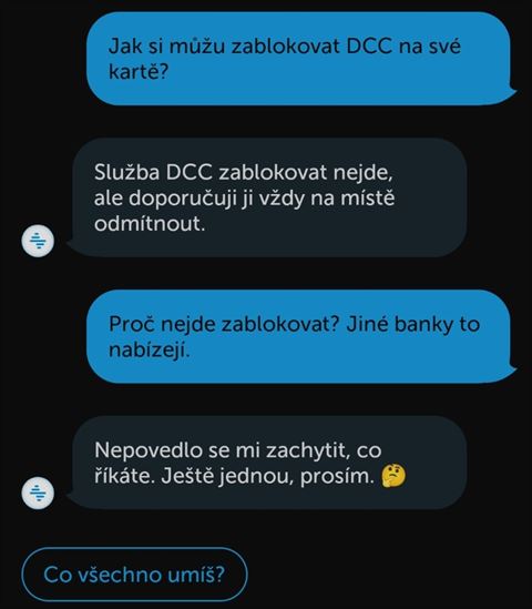 Zajímali jsme se i o možnost zakázat si v nastavení karty nevýhodný převod měny (DCC – Dynamic currency conversion) při placení v cizině. Na otázku „jak si můžu zablokovat DCC na kartě“ odpověděla: „Služba DCC zablokovat nejde, ale doporučuji ji vždy na místě odmítnout.“ S doplňující otázkou „„Proč nejde zablokovat? Jiné banky to nabízejí…“ už si ale neporadila: „Nepovedlo se mi zachytit, co říkáte. Ještě jednou, prosím...“