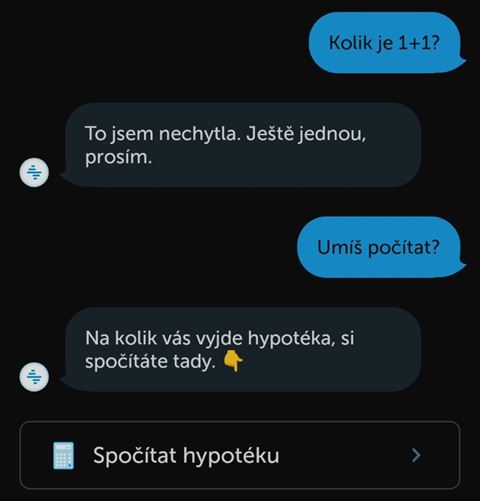 Nad možnosti virtuální asistentky byl dotaz na aktuální úrok hypotéky pro zadaný modelový příklad. Neuspěli jsme ani s prosbou o orientační výpočet měsíční splátky. Neprošla ani jednodušší varianta se spořicím účtem: Kolik si vydělám za rok, když dám na spořicí účet 1 000 000 Kč a úrok je 3,5 % – Kate bohužel nerozuměla otázce, takže nenabídla alespoň odkaz na kalkulačku.