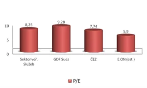 Ukazatel price to earnings (cena akcie v poměru k zisku na akcii) je na hodnotě 7,7, to je níž, než se drží průměr sektoru veřejných služeb (utilities), a pro investora signál možného podhodnocení společnosti. Dřív se ČEZ dlouhodobě obchodoval s ukazatelem P/E kolem; není třeba mít obavu, že by se na tuhle úroveň v případě přiměřeného růstu ceny elektrické energie nevrátil.