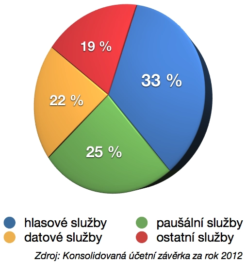 Největší díl výnosů obstarávají hlasové služby, nicméně jedná se o segment, který nejvíce klesá (za rok 2012 pokles o sedm procent). Aktuálně dochází k výraznějšímu přechodu zákazníků k předplaceným službám, to je také důvod, proč klesají výnosy z paušálních služeb relativně pomaleji. Jediným stabilnějším sektorem, který nevykazuje každoroční pokles, jsou datové služby. Jedním z důvodů je rozšiřování smartphonů mezi zákazníky a s tím související rozšiřování internetového připojení v telefonech. Do segmentu „ostatní služby“ řadíme především SMS, prodej zboží a poskytování IT řešení větším společnostem. Tento segment vykazuje také relativně malé tempo poklesu. Strukturu výnosů v roce 2012 ilustruje graf: