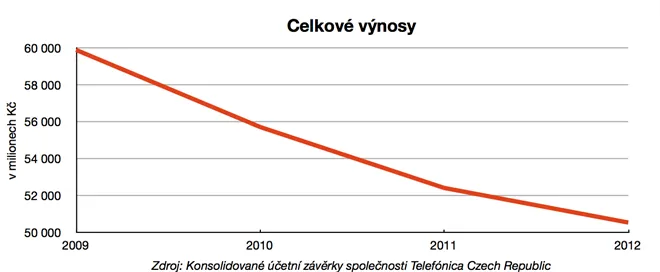 Celkové výnosy české Telefóniky už řadu let klesají, ani v roce 2012 tomu nebylo jinak. Výnosy za loňský rok dosáhly celkové výše 50,5 miliardy korun, což představuje meziroční pokles ve výši 3,5 procenta. Tento pokles byl způsoben především nižšími výnosy v rámci fixního segmentu pevných linek, ale také vyššími náklady v mobilním sektoru. Vývoj celkových výnosů za poslední čtyři roky zobrazuje následující graf: