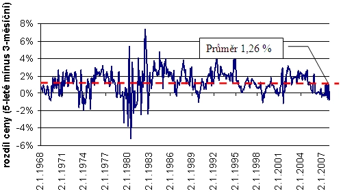 Obecně platí, že krátkodobé peníze jsou levnější než peníze dlouhodobé. Ukazuje to i historie výnosů státních dluhopisů a pokladničních poukázek v USA. Na následujícím grafu je rozdíl mezi cenou pětiletých peněz a cenou tříměsíčních peněz.