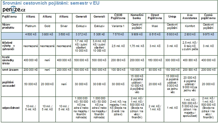 U semestrálních pobytů v Evropské unii vyjde nejlevněji balíček pojištění Komfort od AxaAssistance, který stojí 2 800 Kč. Limity plnění se příliš neliší od ostatních produktů, nižší jsou u pojištění odpovědnosti. Tento produkt rovněž nezahrnuje denní odškodné při úrazu a pojištění storna cesty.