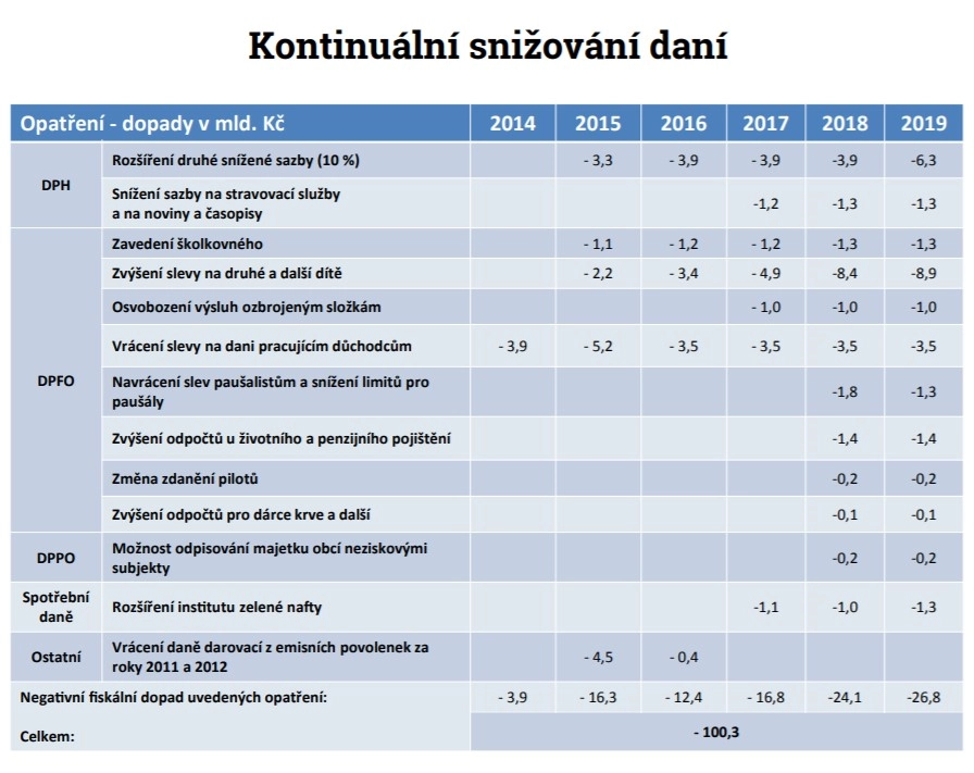 Zmiňuje třeba přesun některých položek do nejnižší sazby DPH, zvýšení odpočtů u penzijního a životního pojištění (pro toho, kdo si platí víc než 1000 korun měsíčně), ale třeba i „osvobození výsluh ozbrojeným složkám“, „změnu zdanění pilotů“ nebo změny u právnických osob.