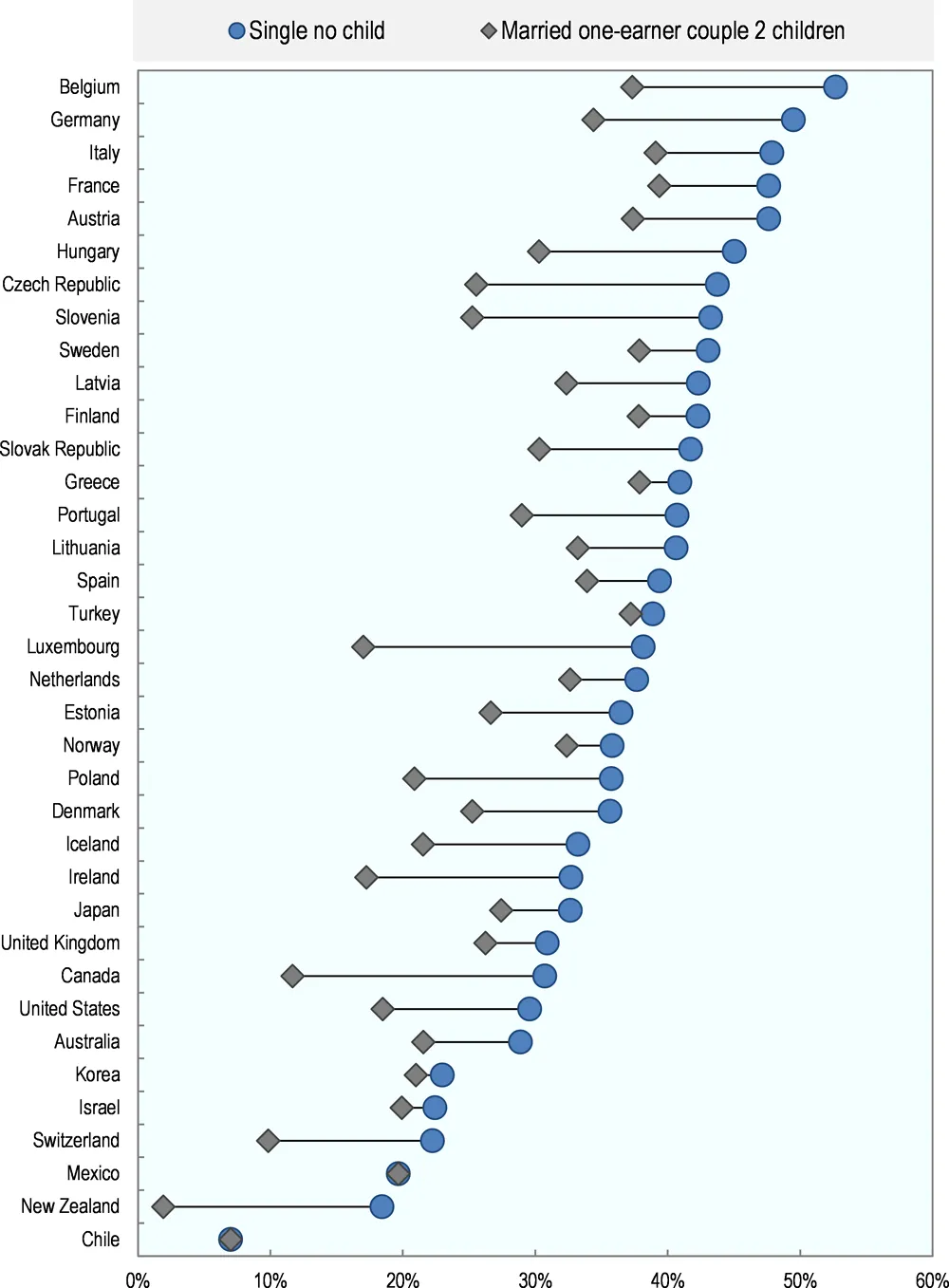 OECD porovnala na jedné straně samostatně žijícího člověka bez dětí s průměrnou mzdou, na druhé straně manžele se dvěma vyživovanými dětmi, kde jeden z rodičů vydělává průměrnou mzdu a druhý si momentálně nevydělává (často proto, že je s malým potomkem doma na rodičovské).