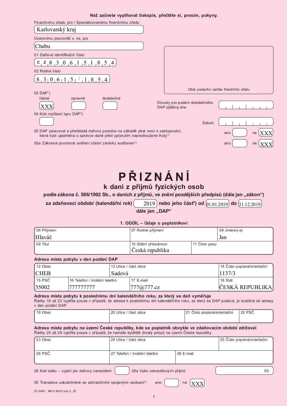 Dál vyplníte, že jde o přiznání za rok 2019 a zadáte údaje o vás: jméno, adresu a můžete uvést i telefonní číslo či e-mailovou adresu.