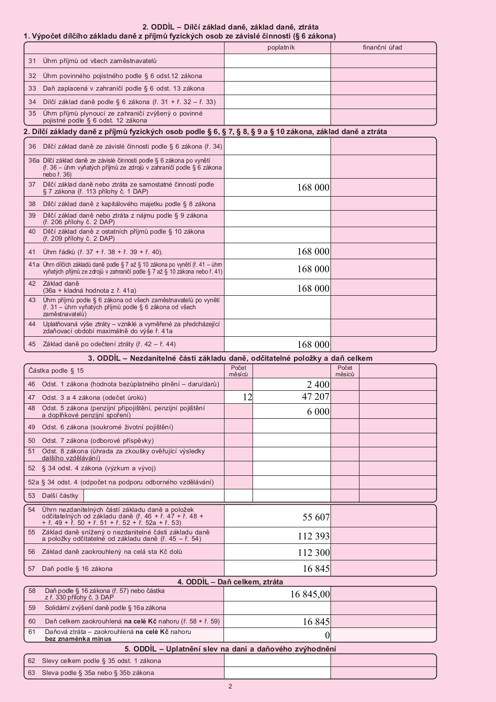 Z příjmů bez nákladů se dál bude počítat daňový základ. Pan Hlaváč má příjmy jen ze samostatné činnosti, propíšou se tedy na stranu dvě daňového přiznání na příslušné řádky. Nenavyšují se ani o příjmy ze zaměstnání, ani ze zahraničí, protože je pan Hlaváč nemá. Daňový základ ani nesnižuje o ztráty z minulých let. Až do řádku 45 se tak daňový základ (příjmy minus výdaje) nemění.