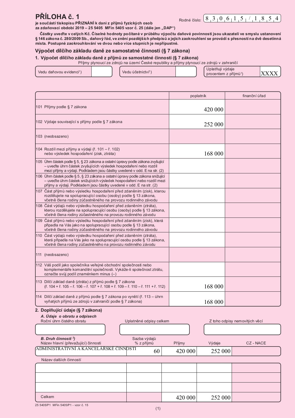 Z první strany přeskočíme na pátou stranu přiznání pana Hlaváče. Jde o přílohu číslo 1, ve které se vyplňují příjmy a výdaje za samostatnou činnost, tedy příjmy z podnikání a výdaje na něj.