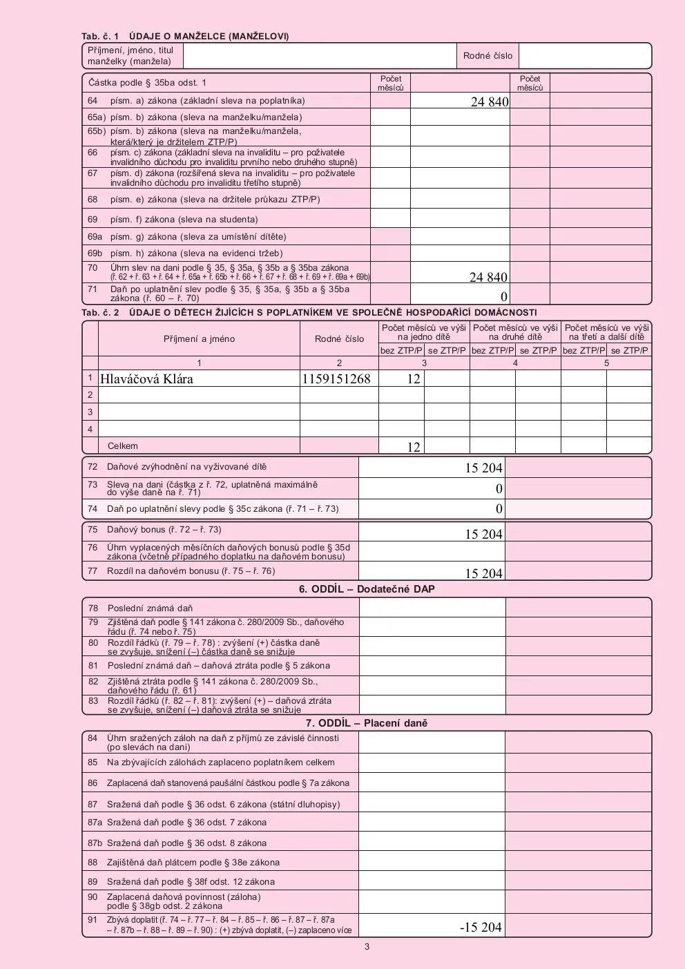 V dalším oddíle pak vyplní údaje za dítě, na které uplatňuje slevu. Sleva na jedno dítě v roce 2019 dělá 15 204 korun = řádek 72. Na řádcích 73 a 74 se počítá výše uplatněné slevy a daň po uplatnění slevy. Protože pan Hlaváč byl s daní na nule už po odečtení základní daňové slevy, je i na těchto řádcích nula. Daňová sleva na dítě funguje jako daňový bonus. Celých 15 204 korun tak stát panu Hlaváčovi vyplatí. Vypíše si tuto sumu na řádky 75 a 77.