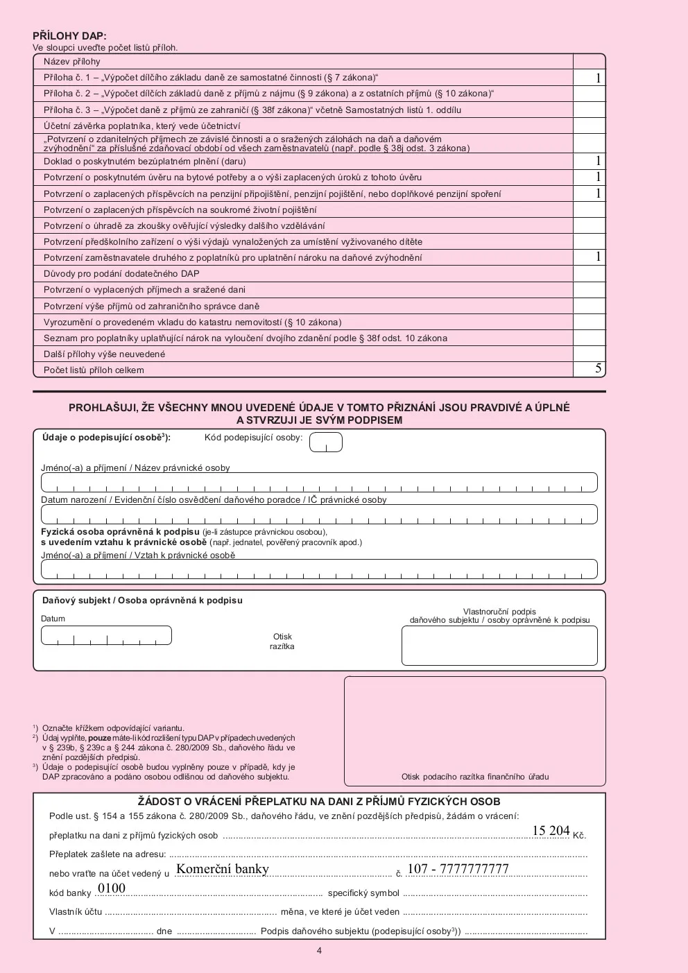 Poslední strana přiznání. Vyplníte zde počet příloh a vlastním podpisem potvrdíte, že zadané údaje v přiznání jsou pravdivé. A v případě pana Hlaváče ještě žádost o vrácení daňového přeplatku (bonus za dítě).