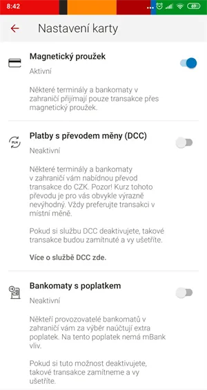 Klienti mBank mají v mobilní aplikaci k dispozici i další dvě nastavení, které konkurence zatím nenabízí: Jde o zákaz výběru ze zahraničního bankomatu, pokud za něj cizí banka účtuje poplatek, a také možnost dočasně si zablokovat magnetický proužek na kartě (a využívat ji tedy jen k bezkontaktním platbám či výběrům bez rizika takzvaného skimmingu).