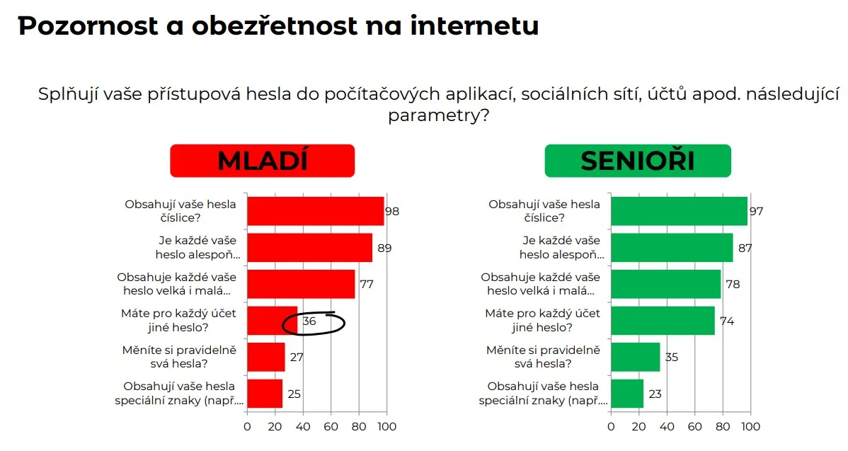 Jiné heslo pro každý účet má pouze 36 procent mladých, zatímco u seniorů je tento podíl víc než dvakrát vyšší (74 %). Pravidelnou obměnu hesla uvedlo v průzkumu 27 % mladých a 35 % seniorů. U dalších doporučení – heslo by mělo obsahovat číslo, malá i velká písmena a aspoň osm znaků – byly výsledky vyrovnané.