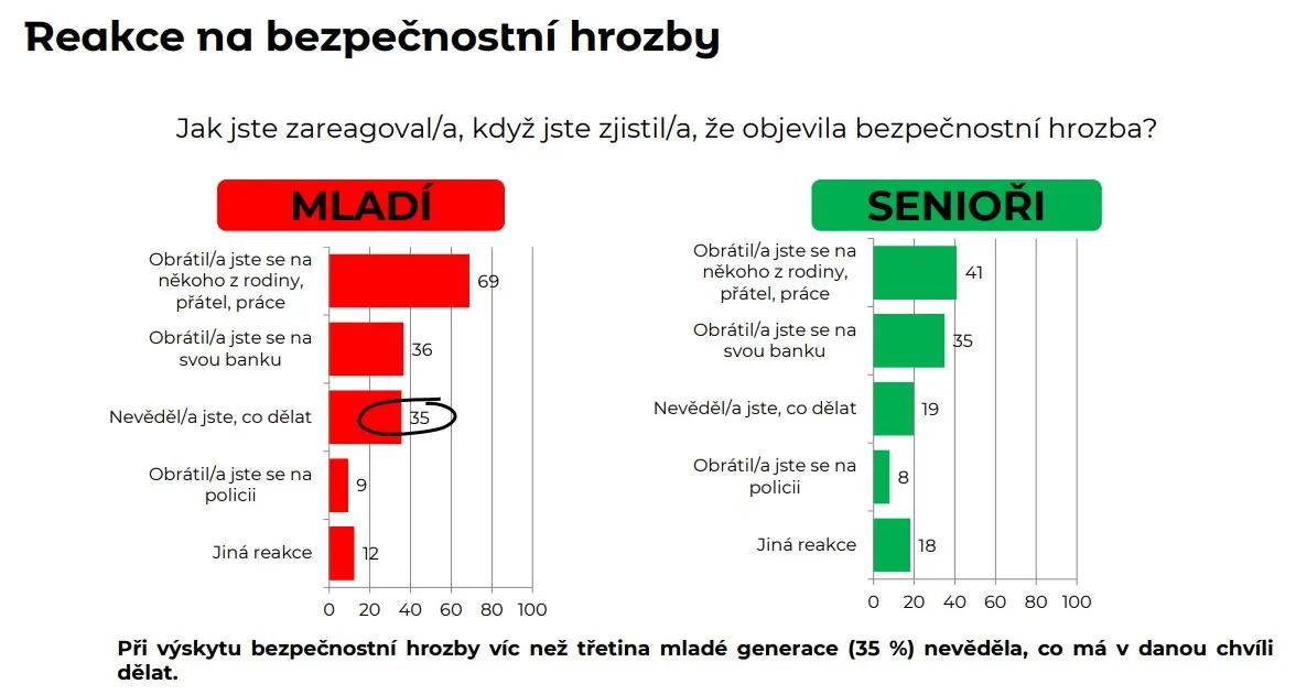 Zdroj: mBank, STEM/MARK„Při výskytu bezpečnostních útoků více než třetina mladé generace (35 %) nevěděla, co má v danou chvíli dělat. Nejčastěji se obraceli na rodinu (69 %) a pak na svou banku (36 %). Senioři odpověděli, že nevědí, co mají dělat, jen v 19 %,“ říká Václav Forst z agentury STEM/MARK.