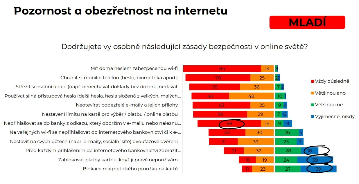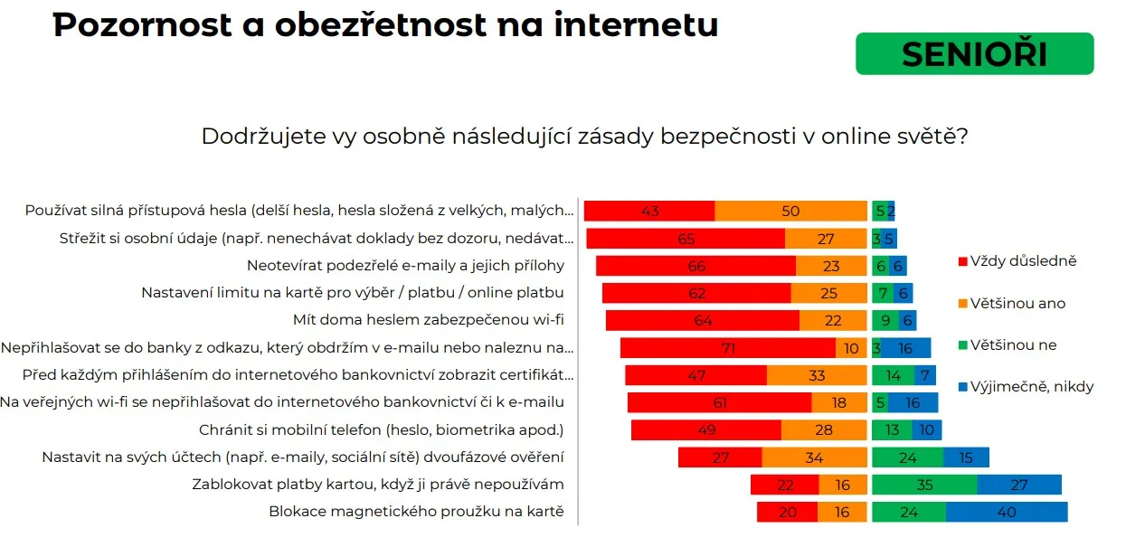 Zdroj: mBank, STEM/MARKSenioři si také častěji uvědomují, že by se do internetového bankovnictví neměli přihlašovat z veřejné wi-fi a že by si měli kontrolovat, zda je otevíraná stránka zabezpečená (kontrola ikony zámku před webovou adresou). Tuto kontrolu mladí uváděli v 53 %, zatímco senioři v 80 %.