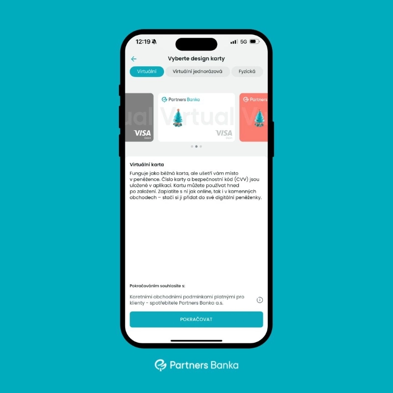 Partners Banka nabízí klientům virtuální karty s vánočním motivem. Zájemci si je mohou zřídit do konce prosince. Dostupné jsou přes její bankovní aplikaci, a to i v dětských variantách s křečkem.