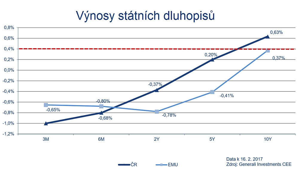 A co tedy můžeme očekávat třeba od českých dluhopisů? Tuzemská inflace už v lednu překročila dvouprocentní cíl ČNB, čímž dává centrální bance možnost okolo poloviny roku ukončit kurzový závazek. Podle Kukačky se poté dá očekávat další pokles cen českých dluhopisů, které jsou nyní následkem nákupů zahraničních investorů spekulujících na posílení koruny nadhodnoceny a při splatnostech do tří let poskytují investorům záporný výnos.