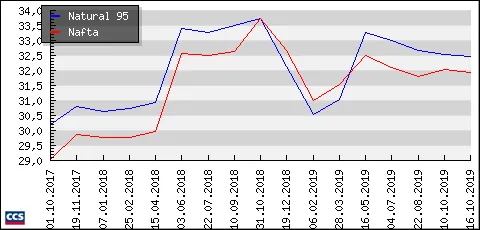 Vývoj průměrné ceny benzinu a nafty v Česku. Zdroj: CCS