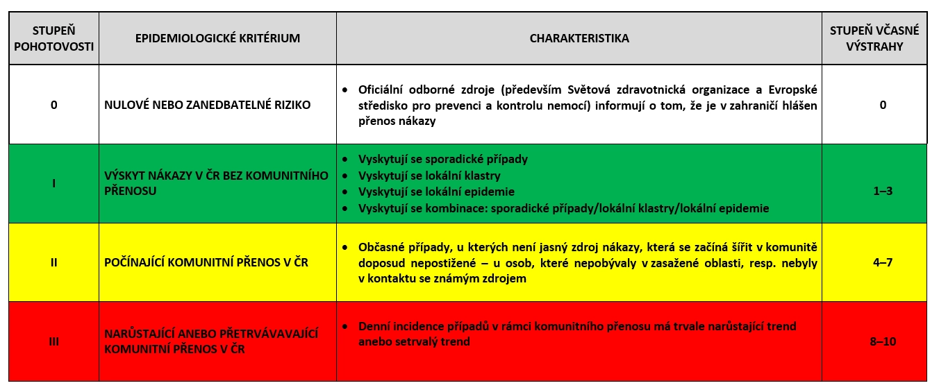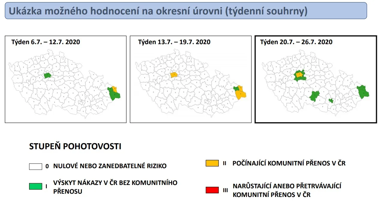 Většina okresů má na mapě bílou barvu (stupeň pohotovosti nula). Devět regionů má zelenou (stupeň jedna), znamenající výskyt nákazy bez takzvaného komunitního přenosu: Jde o Prahu a okresy Praha-západ, Praha-východ, Ostrava-město, Brno-město, Karviná, Frýdek-Místek, Jihlava a Prachatice.