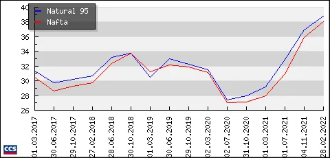 Ceny benzinu a nafty jsou momentálně v Česku nejvyšší v historii, ukazují to data společnosti CCS. Litr benzinu Natural 95 se podle nich včera celorepublikově prodával průměrně za 38,82 koruny. Průměrná cena tak překonala dosud rekordní cenu ze 13. září 2012, kdy se benzín prodával za 38,56 koruny za litr. Litr nafty se včera poprvé prodával průměrně za více než 38 korun za litr, konkrétně za 38,05 koruny.