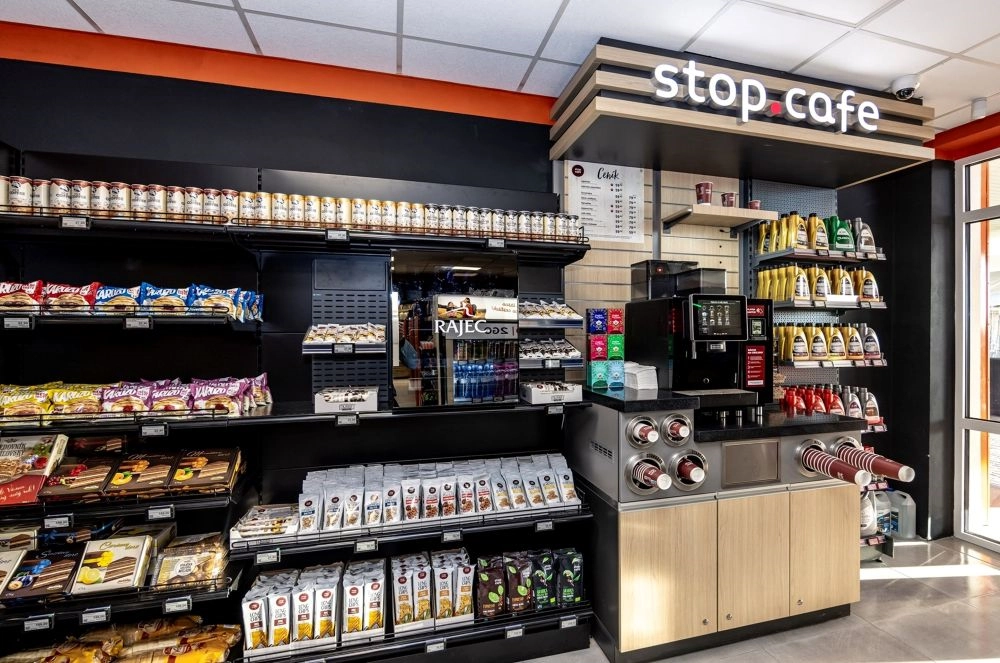 Benzinka s obchodem funguje nepřetržitě a kromě potravin a doplňkového zboží je vybavena automatickým kávovarem a výběrem produktů pod privátní značkou Stop Cafe.