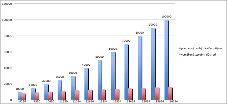 Zvětšíte kliknutím. Pro zjednodušení počítáno pro člověka právě odcházejícího do penze za předpokladu 40 let doby sociálního pojištění