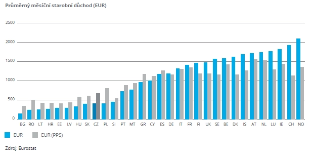 V tomto ohledu nabízí nejlepší životní úroveň Rakousko a Nizozemsko, kde se průměrný důchod pohybuje 37, respektive 34 procent nad průměrem EU.