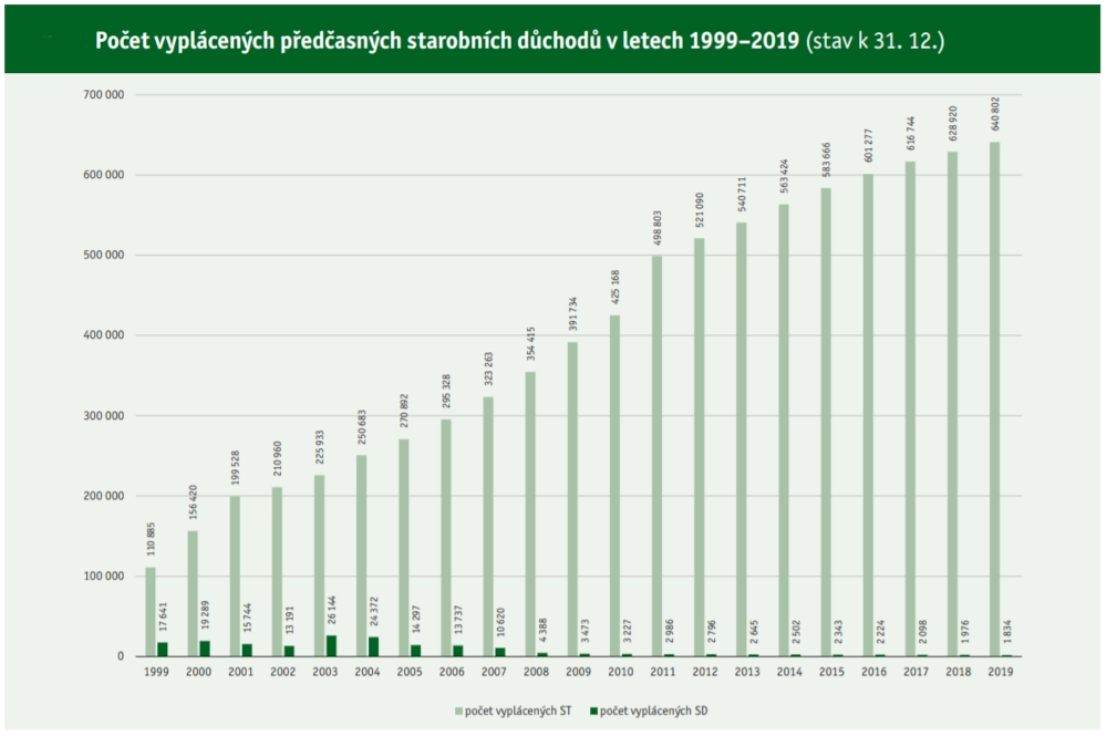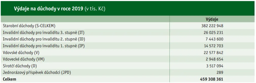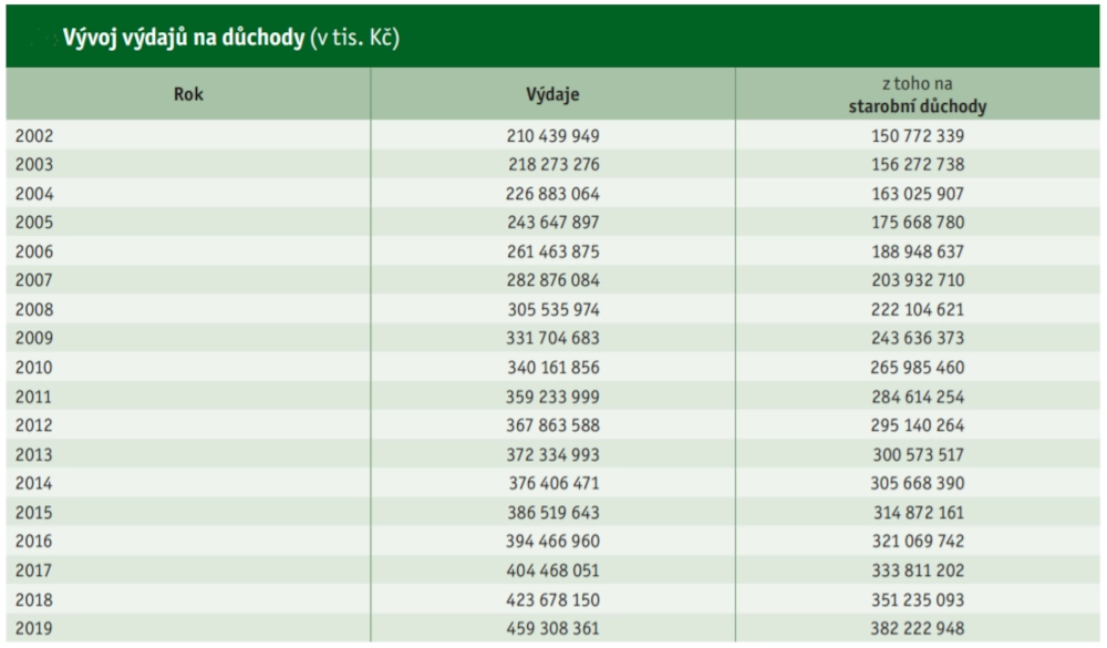 V roce 2019 šlo na starobní důchody 382 miliard korun, což je 2,5násobek výdajů v roce 2001. Výdaje na důchody tak rostly rychleji než celkové výdaje státního rozpočtu, které za stejnou dobu stouply na 2,2násobek stavu z roku 2001.
