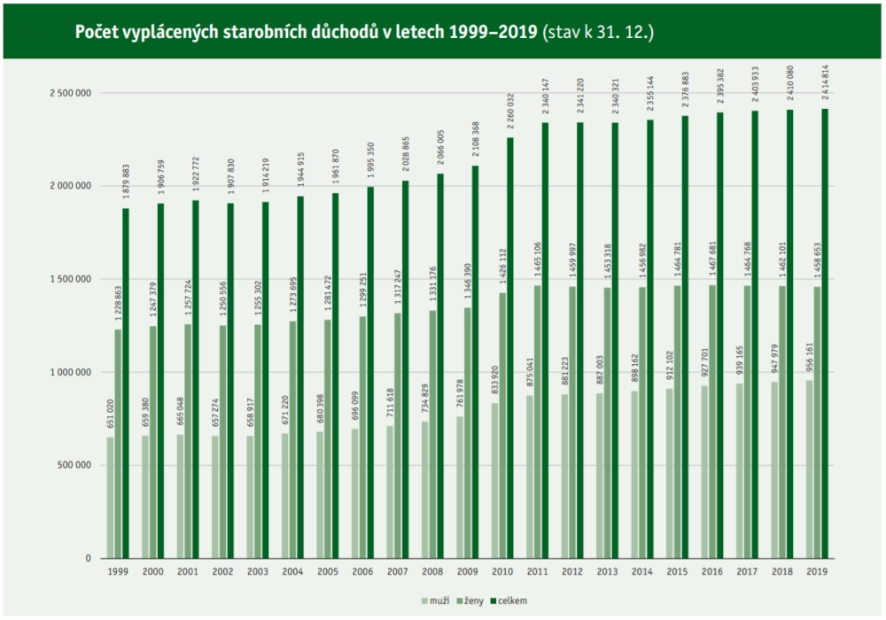 Česká správa sociálního zabezpečení v roce 2019 vyplácela 2,41 milionu starobních důchodů, z toho zhruba 40 procent pobírali muži a 60 procent ženy. Celkový počet starobních důchodců za posledních dvacet let vyrostl o 28,5 procenta.