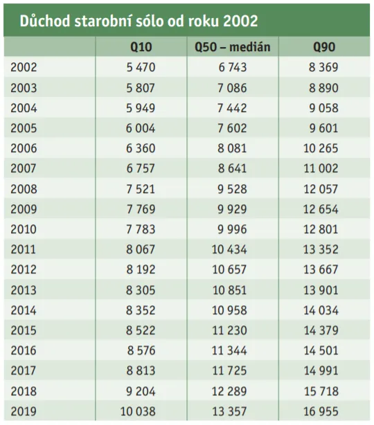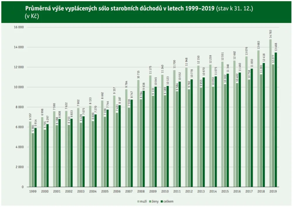 Mezi roky 1999 a 2019 vzrostl průměrný starobní důchod na 2,3násobek. Zvýšil se tak méně než průměrná mzda, která za tu dobu stoupla na 2,7násobek hodnoty roku 1999 – z tehdejších 12 797 na loňských 34 111 korun měsíčně.