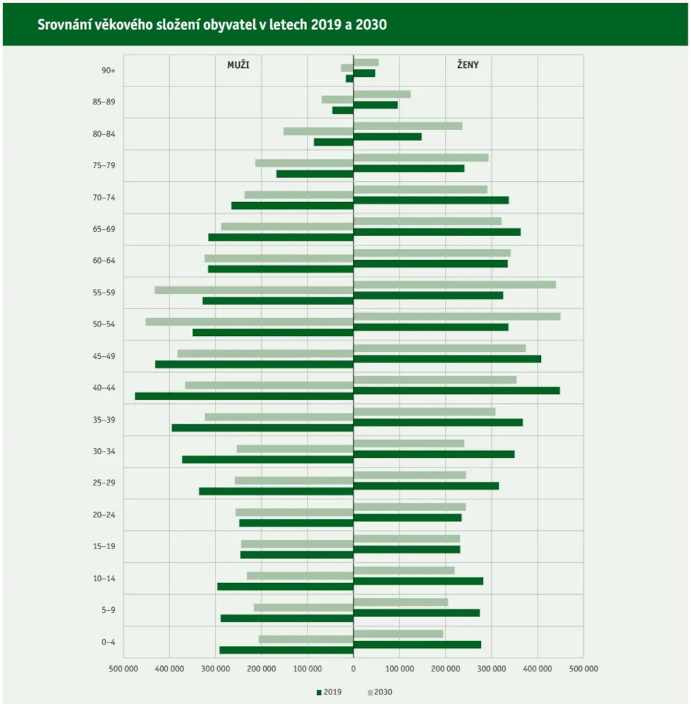 Ročenka ilustruje také největší problém důchodového systému: stárnutí populace. Zatímco v roce 2019 (tmavě zelené linky) byla v Česku nejpočetněji zastoupena věková skupina mezi 35. a 49. rokem života, v roce 2030 (světle zelené) to mají být lidé od 50 do 59 let.