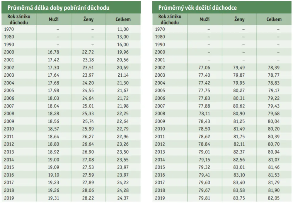 V roce 2019 dosáhla průměrná délka starobního důchodu 24,37 roku. Výrazně se ale liší podle pohlaví: Zatímco muži v důchodu stráví průměrně něco přes 19 let, u žen je to více jak 28 let.