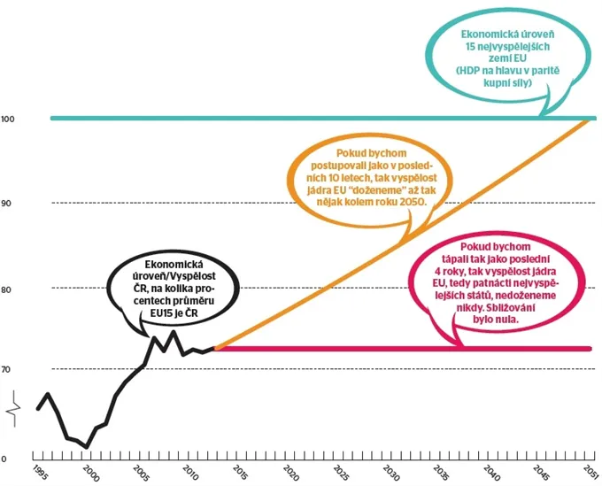Kouněte na graf níž, první půlku členství v Evropské unii jsme zvládli, druhou proflákali… Pokud bychom pokračovali dál jako v posledních čtyřech pěti letech, nedoženeme německé a rakouské platy nikdy.