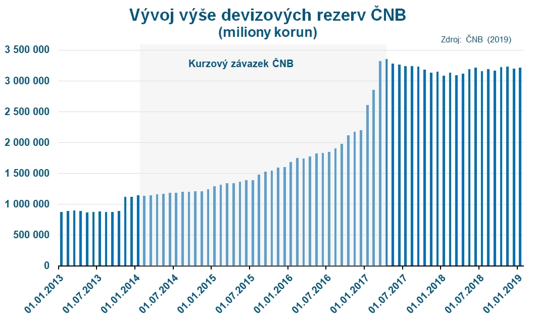Jak je vidět z grafu, během trvání kurzového závazku – od listopadu 2013 do dubna 2017 – se hodnota devizových rezerv České národní banky zvyšuje o přibližně dva biliony korun. Tyto prostředky centrální banka průběžně investuje do zahraničních cenných papírů, zejména obligací zahraničních vlád s nejvyššími ratingy. Výnosy z těchto investic zvyšují hodnotu jejího hospodářského zisku.