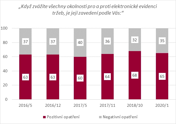 Většina lidí (60 %) podporuje elektronickou evidenci tržeb jako nástroj k narovnání podnikatelského prostředí. Dvoutřetinová většina (66 %) uznává přínos EET ke zlepšení výběru daní. A téměř dvě třetiny občanů Česka (64 %) pak považuje za spravedlivé plošné rozšíření EET do všech sektorů ekonomiky, ke kterému dojde od začátku května.