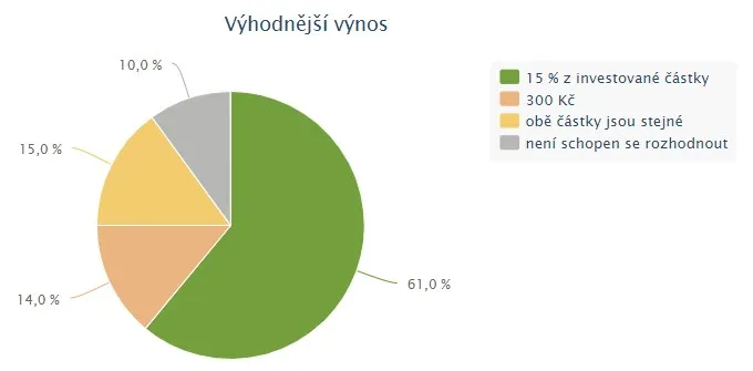 Správnou variantu – tedy 15 % z investované částky – v průzkumu zvolilo 61 procent lidí. Šlo hlavně o takzvané třicátníky, lidi s maturitou a vyšším vzděláním nebo osoby s nejvyššími příjmy.