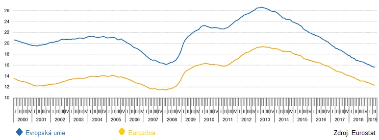 Dlouhodobý vývoj nezaměstnanosti v EU a eurozóně