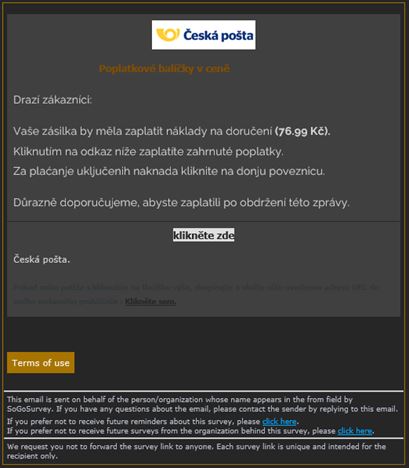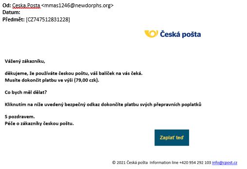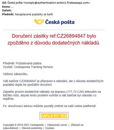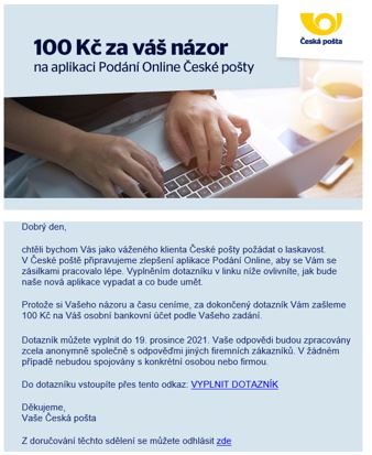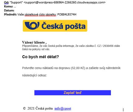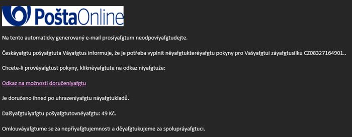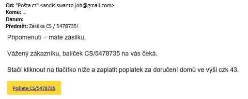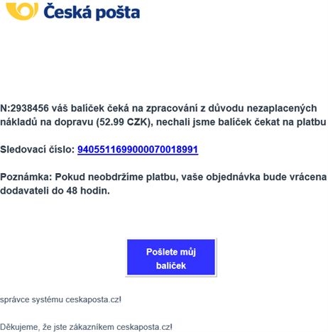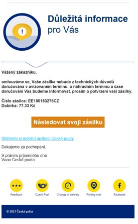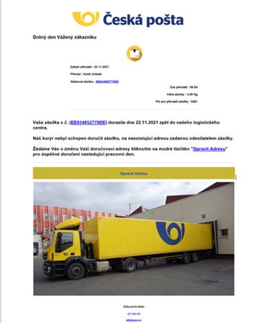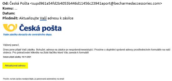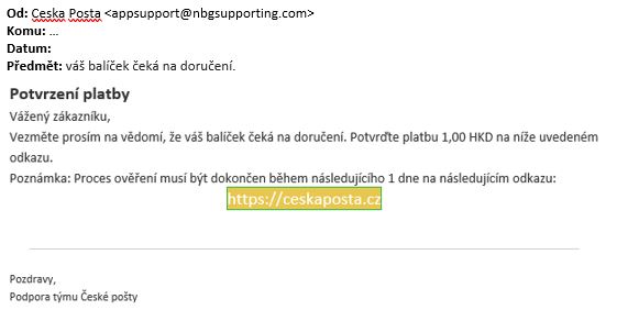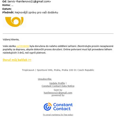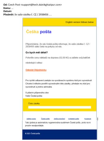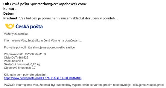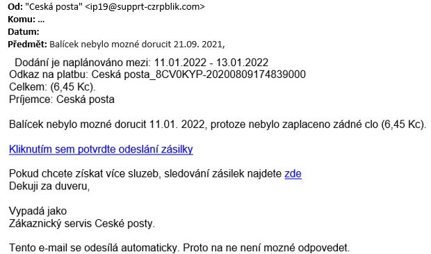 Kdo že vám to píše? Tváří se jako Česká pošta, ale adresa je "ip19@supprt-czrpblik.com". Věřte, že takhle špatně na tom státní podnik s internetovou komunikací není.